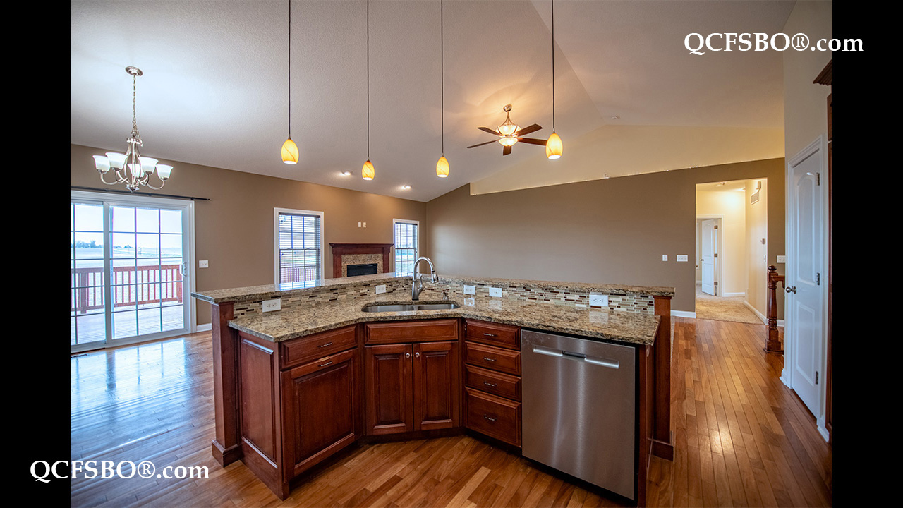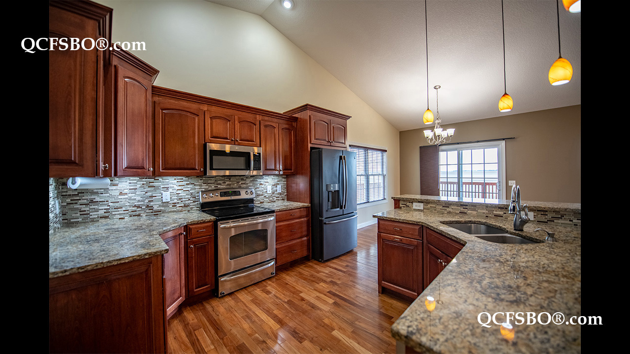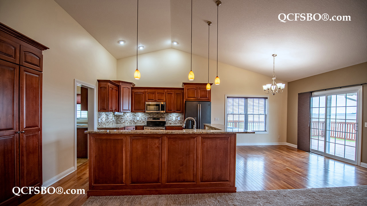 The kitchen is designed for both everyday living and entertaining, showcasing granite countertops, a tiled backsplash, center island, breakfast bar, walk-in pantry, and eat-in dining area, along with updated appliances including a newly mounted microwave. Abundant lighting—recessed, cabinet, and task lighting—enhances the space, while window blinds and dressings throughout add convenience and style.